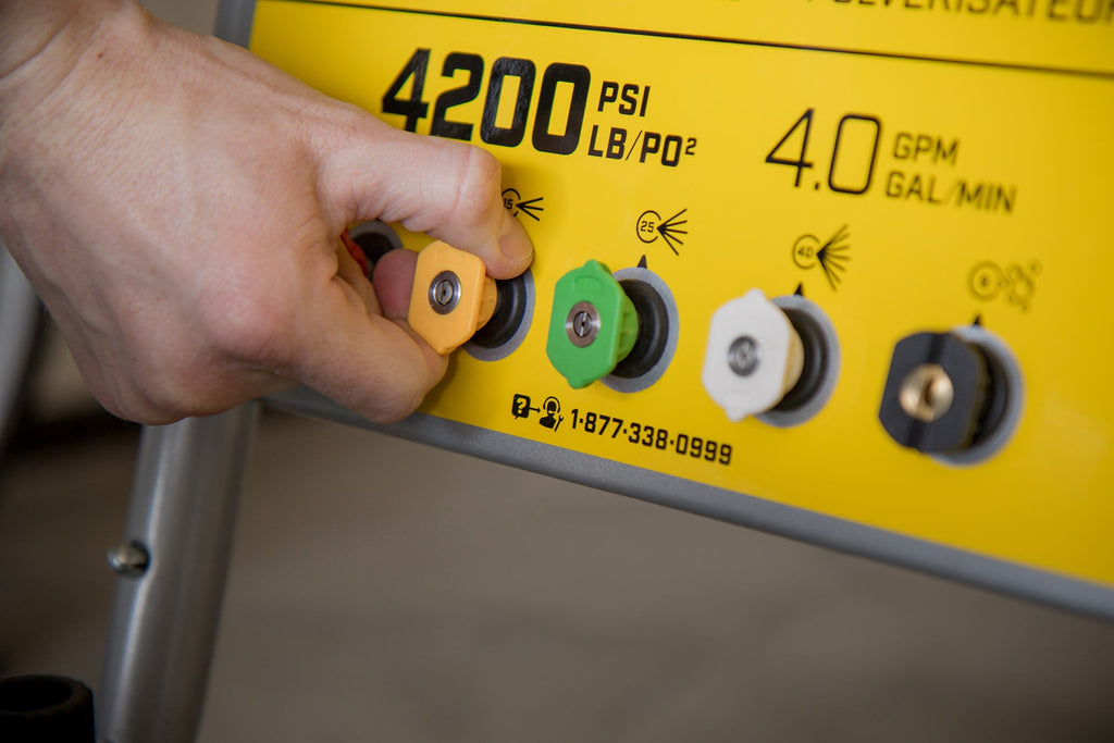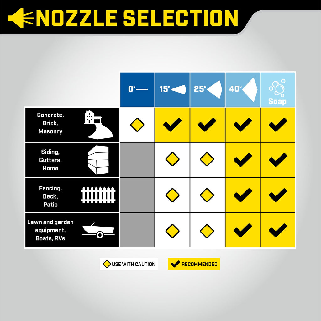 Ważne jest, aby wybrać odpowiednią dyszę do zadania, ponieważ rozmiar dyszy wpływa na przepływ i ciśnienie wody. Pięć szybkozłączek (0°, 15°, 25°, 40°, mydło) zapewnia maksymalną wydajność czyszczenia w każdym rodzaju projektu.